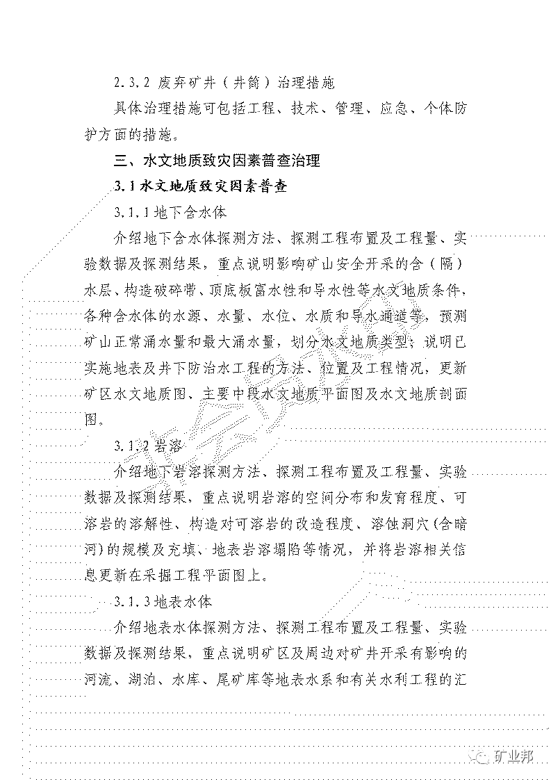 1.地下含水體。查明影響礦山安全開采的含(隔)水層、構(gòu)造破碎帶、頂?shù)装甯凰院蛯?dǎo)水性等水文地質(zhì)條件,以及各種含水體的水源、水量、水位、水質(zhì)和導(dǎo)水通道等情況,預(yù)測(cè)礦山正常和最大涌水量,劃分水文地質(zhì)條件復(fù)雜程度,完善礦區(qū)水文地質(zhì)圖、主要中段水文地質(zhì)平面圖及水文地質(zhì)剖面圖;采取有效措施進(jìn)行治理。